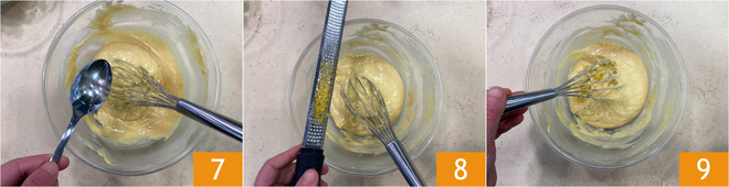 En este punto, agregue el aceite 7 y aromatice con la ralladura de limón 8. Dé una última mezcla y reserve 9.