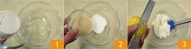 Para preparar los buñuelos de requesón, vierta el requesón 1 y el azúcar moreno en un bol 2, luego mezcle con una espátula. Añada la ralladura de limón 3.
