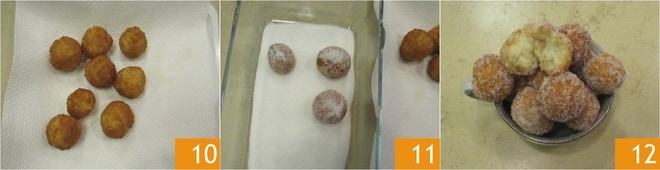 Transfiera los buñuelos a papel absorbente 10, luego páselos aún calientes por azúcar en grano 11. ¡Sus buñuelos de requesón están listos para ser disfrutados 12!