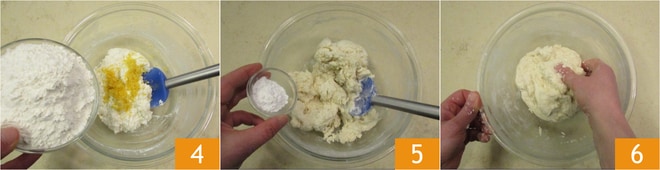 Añada también la harina 4 y la levadura 5 y mezcle de nuevo, luego amase con las manos hasta obtener una masa compacta y homogénea 6.