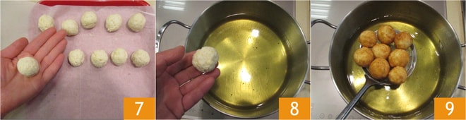 Tome pequeñas porciones de masa de unos 20 g cada una y redondéelas entre las palmas de las manos para formar bolas 7; con estas cantidades obtendrá unos 30-32 piezas. Coloque las bolas en una bandeja forrada con papel de horno y mientras tanto caliente el aceite de girasol a una temperatura de 160°. Fría pocos piezas a la vez para evitar que la temperatura del aceite baje 8. Escurra los buñuelos cuando estén dorados, tardarán unos 4-5 minutos 9.
