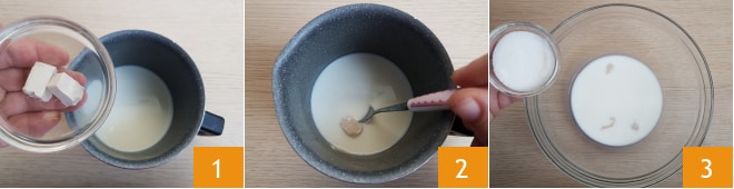 Para preparar los buñuelos de ricotta y peras, lo primero que tienes que hacer es calentar ligeramente la leche en un cazo, debe estar tibia. Añade la levadura de cerveza 1 y remueve con una cucharita hasta que se disuelva completamente. Vierte dentro de un bol grande, añade el azúcar 3