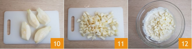 córtala en gajos y elimina el corazón central 10. Luego corta la pera en cubitos 11 y añádelos a la masa 12.