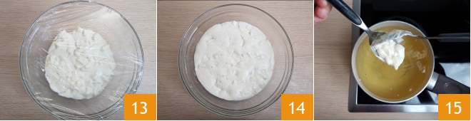 Remueve bien para integrar todo y cubre con film transparente 13. Deja fermentar en el horno apagado solo con la luz encendida durante 2 horas 14. Una vez que la masa haya fermentado, calienta el aceite de semillas en un cazo hasta alcanzar una temperatura de 170°. En este punto, toma una cucharada de masa y viértela en el aceite caliente, ayudándote a deslizarla con otra cuchara 15.