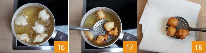 Fríe 4-5 buñuelos a la vez 16, dándoles la vuelta con frecuencia. Cuando estén bien dorados, tardará unos 5 minutos, escúrrelos 17 y colócalos sobre una bandeja forrada con papel de cocina 18.