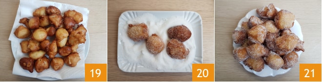 Continúa de esta manera hasta freírlos todos 19. Pasa los buñuelos de ricotta y peras todavía calientes por el azúcar 20 y sírvelos 21.