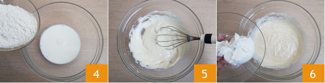 y la harina en 3-4 veces 4, removiendo poco a poco con una varilla 5, para obtener una masa densa sin grumos. Añade también la ricotta 6,