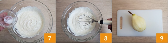 una pizca de sal 7 y mezcla con la varilla 8. Pela la pera 9,
