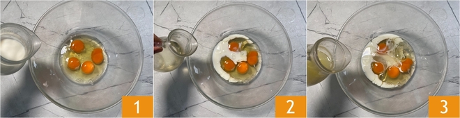 Para preparar los buñuelos suaves de limón, comienza con la masa. En un bol grande mezcla los huevos, la leche 1, el aceite de semillas 2 y el zumo de limón 3.