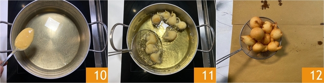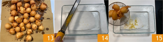 Continúa de esta manera hasta terminar la masa 13, obtendrás unos 40. Mientras tanto, en otro bol mezcla el azúcar y más cáscara de limón rallada 14, luego introduce algunos buñuelos aún calientes 15.