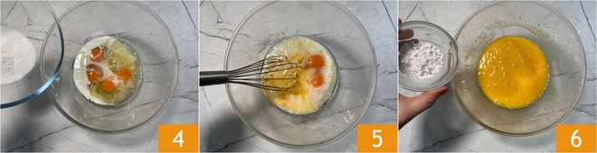 Luego añade también el azúcar 4 y mezcla con unas varillas 5. Agrega la levadura para dulces 6.