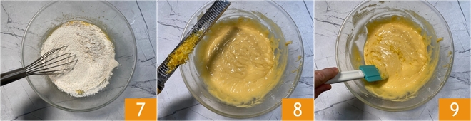 Añade la harina y mezcla bien 7 hasta obtener una mezcla suave y cremosa. Aromatiza con la cáscara rallada de un limón 8 y mezcla con una espátula 9 para incorporarla.