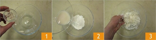 Para preparar los burger buns empezad con la biga. Verted el agua en un bol, añadid la levadura y mezclad para disolverla 1. Verted la mezcla obtenida en otro bol donde ya habréis colocado la harina. Amasad rápidamente primero con un tenedor y luego con las manos 3.