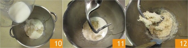Añadid también la leche 10, luego colocad el gancho 11 y empezad a trabajar los ingredientes 12.