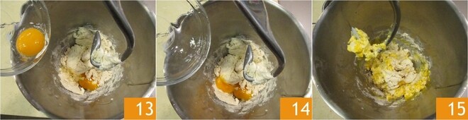 Añadid entonces el huevo 13 y, después de que se haya absorbido, también la yema 14. Continuad trabajando los ingredientes con el gancho 15 hasta obtener una masa bien ligada y suave.