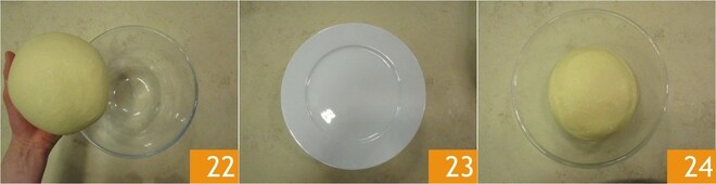 Pasadla a un bol 22, cubrid con un plato 23, o con film, y dejad levar durante 2 horas a temperatura ambiente, o hasta que haya duplicado su volumen 24.