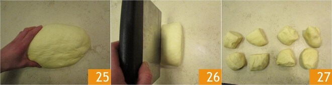 Pasado el tiempo de levado, transferid la masa a la superficie de trabajo 25 y divididla en trozos de 110 g cada uno 26, debéis obtener 8 27.