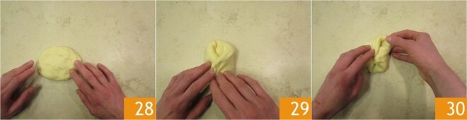 Trabajad la masa hasta completar la absorción de la mantequilla, hasta que resulte suave, lisa y bien ligada 19. Luego transferidla a una superficie 20 y formad una esfera con la masa 21.