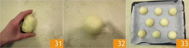 Voltead la masa 31 y con la mano formad una bola bien firme 32. Repetid la misma operación y conforme vayáis obteniendo los buns, colocadlos en una bandeja cubierta con papel de horno, distanciándolos entre sí 33.