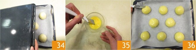 Cubrid con una segunda bandeja 34 y dejad levar durante 30 minutos más. Luego batid la yema con la leche 35 y usadla para pincelar los panecillos 36.
