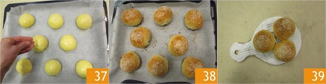Espolvoread con semillas de sésamo blanco 37 y hornead en horno estático precalentado a 190° durante 25-30 min. Sacad del horno y dejad enfriar un poco antes de servir vuestros burger buns 39.