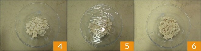 Debéis obtener una masa desmenuzada, no bien amalgamada 4. Cubrid con film y dejad madurar durante 2 horas a temperatura ambiente 5, o hasta que haya duplicado su volumen 6.