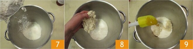 En el bol de la amasadora verted las dos harinas 7, añadid la biga madura 8 y la miel 9.
