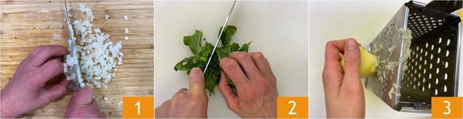 Para preparar los burgers de espinacas, primero pelad y picad finamente la cebolla 1. Luego lavad las espinacas, escurridlas y picadlas también groseramente 2. Pelad las patatas y ralladlas en crudo 3.