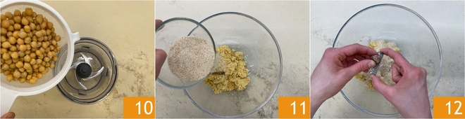 Mientras tanto, triturad los garbanzos ya cocidos 10 hasta obtener una crema gruesa. Pasad el puré de garbanzos a un bol grande y añadid el pan rallado 11 y la nuez moscada 12.