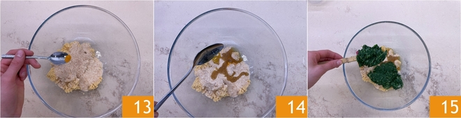 Añadid también la cúrcuma 13 y 2 cucharadas de aceite 14. Luego, incorporad la mezcla de espinacas y patatas 15.