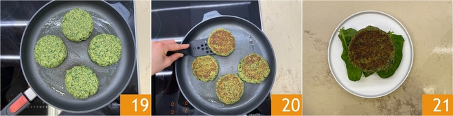 Cocinad los burgers en una sartén antiadherente ligeramente engrasada 19 durante 10 minutos, dándoles la vuelta a mitad de cocción 20 para que queden bien dorados por ambos lados. Servid inmediatamente vuestros burgers de espinacas 21.