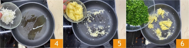 En una sartén, verted dos cucharadas de aceite, añadid la cebolla picada 4 y dejad que se ablande a fuego lento durante unos 5 minutos. Luego, añadid las patatas 5 y las espinacas 6.