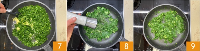 Cocinad durante unos 5-6 minutos a fuego medio, removiendo de vez en cuando 7 y sazonando con sal y pimienta 8. Cuando la mezcla esté suave y seca, apagad el fuego 9 y dejad que se temple.
