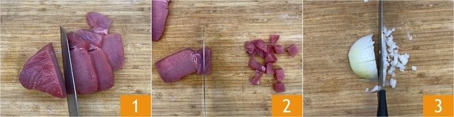Para preparar las busiate al ragú de atún, corte el atún fresco primero en rodajas de 1,5-2 cm de grosor 1 y luego en cubos 2. Limpie y pique finamente la cebolla 3.