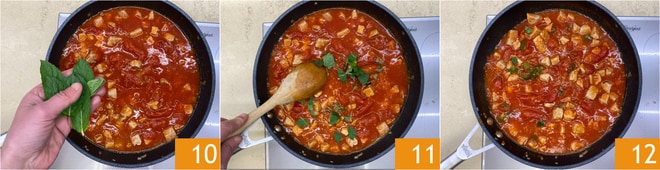 Salar, pimentar y aromatizar con las hojas de menta desmenuzadas con las manos 10. Mezclar bien 11, bajar nuevamente la llama y dejar cocinar durante unos 30 minutos 12.