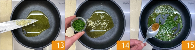 Mientras tanto, prepare la muddica: en otra sartén, caliente el aceite con el ajo 13 y el perejil 14, finamente picados. Añada también el chile 15.