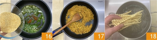 Vierta el pan rallado 16 y deje dorar a fuego moderado, removiendo con frecuencia 17. Reserve la muddica y ponga a hervir una olla con agua salada. Cuando la salsa esté lista, sumerja la pasta en el agua hirviendo salada 18.