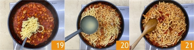 Escurra las busiate muy al dente y transfiéralas a la sartén con el condimento 19. Termine de cocinar la pasta ayudándose con un cucharón de su agua de cocción 20, mezclando bien para amalgamar todo 21.