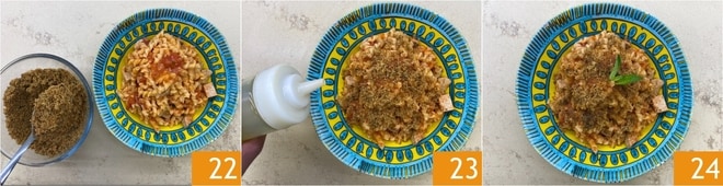 Sirva y decore con abundante muddica 22, luego complete el plato con un chorrito de aceite en crudo 23 y algunas hojitas de menta fresca: ¡sus busiate al ragú de atún están listas para ser servidas 24!