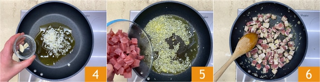 Caliente el aceite en una sartén grande antiadherente, luego agregue la cebolla picada y los dientes de ajo enteros 4 y sofría a fuego medio-bajo hasta que la cebolla se vuelva transparente. En este punto, retire el ajo y añada los cubos de atún 5. Dore el atún a fuego lento durante 2-3 minutos, tratando de girarlo con cuidado por todos los lados para evitar que se rompa 6.