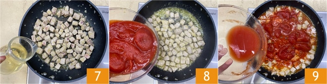 En este punto, suba la llama y desglase con el vino blanco 7. Una vez evaporado, vierta los tomates pelados 8 y desmenúcelos con la cuchara, luego agregue un poco de agua, la suficiente para enjuagar el recipiente 9. Añada también el concentrado de tomate.