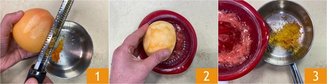 Para preparar la caballa a la parrilla con salsa de cítricos, comienza con la salsa: ralla la cáscara del limón, la naranja y el pomelo 1, luego extrae el jugo 2. En un cazo, combina la cáscara rallada y el jugo de los cítricos 3.