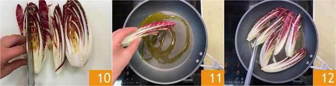 Reserva la salsa y encárgate de la achicoria: divide las cabezas en gajos de aproximadamente 3 cm de grosor 10. Calienta el aceite en una sartén y coloca la achicoria 11, luego sofríe a fuego medio por ambos lados 12.