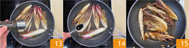Cuando comience a formarse una costra, añade sal, pimienta 13 y vinagre balsámico 14; cocina la achicoria durante un total de aproximadamente 5 minutos. Una vez cocida, resérvala 15.