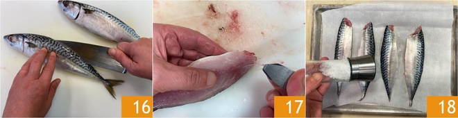 En este punto, limpia la caballa: extrae los filetes 16 y elimina las espinas 17, luego sálalos por ambos lados 18.