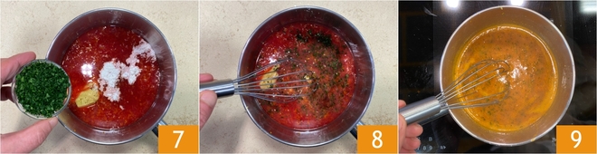 Sazona con sal, pimienta y perejil picado 7, luego mezcla bien 8. Ponlo al fuego y deja que espese durante unos diez minutos, removiendo continuamente 9.