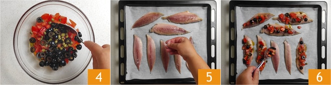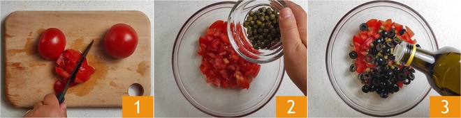 Para preparar la caballa al horno, primero lava y seca los tomates, luego córtalos en cubitos muy pequeños 1. Transfiérelos a un bol y añade las alcaparras 2, las aceitunas negras cortadas en rodajas y el aceite de oliva virgen extra 3.