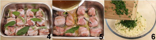 Espolvorea por encima las hojas de salvia, laurel y el romero 4. Hornea la bandeja así preparada y deja cocinar durante unos 30/40 minutos a 180 grados en horno estático, rociando de vez en cuando con el vino blanco y un poco de caldo caliente 5. Mientras tanto, prepara en un bol la miga de pan desmenuzada mezclada con el perejil picado y el ajo machacado 6.