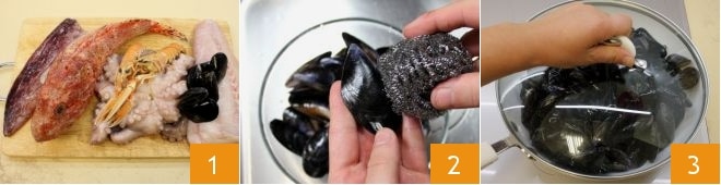 Para preparar el cacciucco a la livornesa comenzad limpiando los pescados y moluscos que necesitáis: mejillones, pulpo, calamares, sepia, cola de rape, cabracho, cigalas 1. Limpiad y coced los mejillones. Después de haberlos lavado bajo agua corriente, eliminad todos los percebes y con un movimiento enérgico arrancad el biso que sale de las valvas. Después, siempre bajo el agua corriente fresca, frotad enérgicamente los mejillones utilizando un estropajo de acero o un cepillo rígido 2. Poned los mejillones limpios en una cazuela, cerrando con la tapa 3
