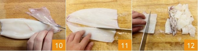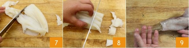 Para limpiar las sepias debéis separar delicadamente la cabeza y los tentáculos del manto, lavarlas bien y quitar la pluma de cartílago y la bolsa de tinta. Picad los tentáculos 7 y las cabezas 8. Proceded con los calamares. Una vez extraída la cabeza, buscad la pluma de cartílago transparente que se encuentra en el manto y extraedla delicadamente 9,